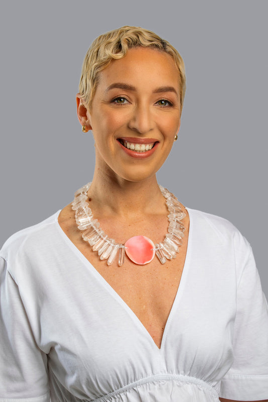 Big Tooth Quartz with Hand Carved Conch Shell Medallion Necklace