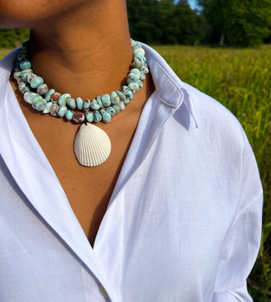 Inspired by the beauty of the ocean’s edge, the Shoreline Dreams collection captures the essence of endless summer days and coastal serenity. Hand-knotted with all-natural gemstone and natural materials sourced from The Bahamas, each piece reflects nature’s artistry, from the calming blues of Larimar to the earthy tones of Tree Agate and Yellow Jade.