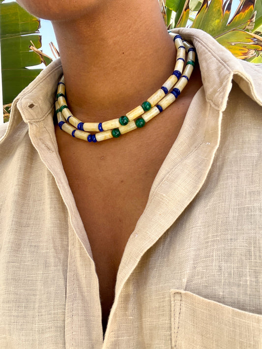 Yellow Jade Tubes with Malachite and Lapis Lazuli